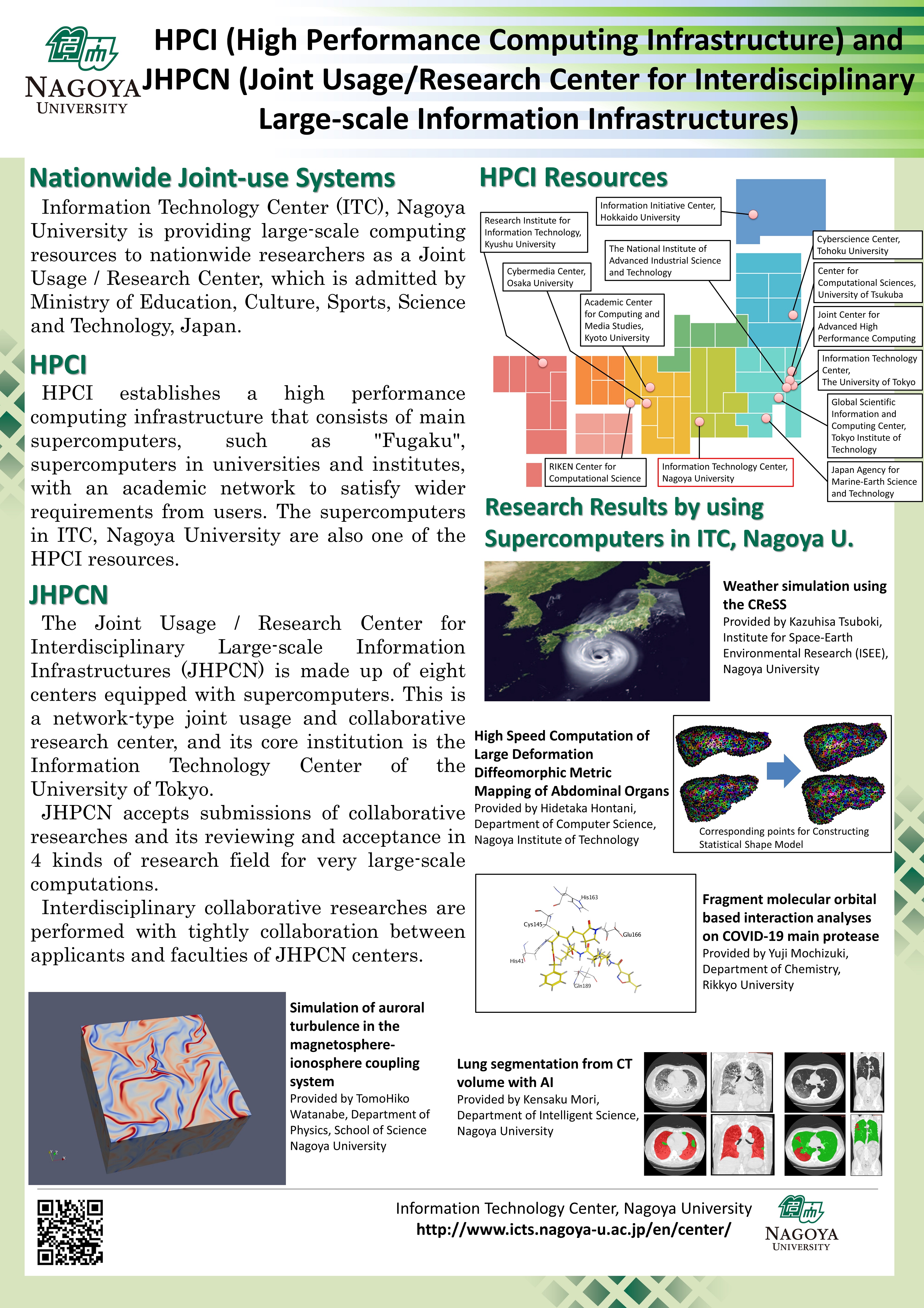 The Information Technology Center, as part of the Information & Communications, Nagoya University, cooperates with the Information Strategy Office, Information Security Office and the Information Promotion Department in order to take responsibility for the development and stable operation of the information infrastructure. including supercomputers and networks for education and research at Nagoya University. The Information Technology Center also plays a role in the research and development of High Performance Computing technology in Japan as part of the Joint Use/Research Center for Interdisciplinary Large-Scale Information Infrastructures which consists of eight facilities, including the Information Technology Centers of seven largest national universities in Japan and the Tokyo Institute of Technology Global Scientific Information and Computing Center. They were originally National Joint-Use Facilities, became Joint Use/Research Centers during the last fiscal year and they provide not only support for users, but also engage in joint national research in cooperation with the Information Technology Centers of the eight universities.