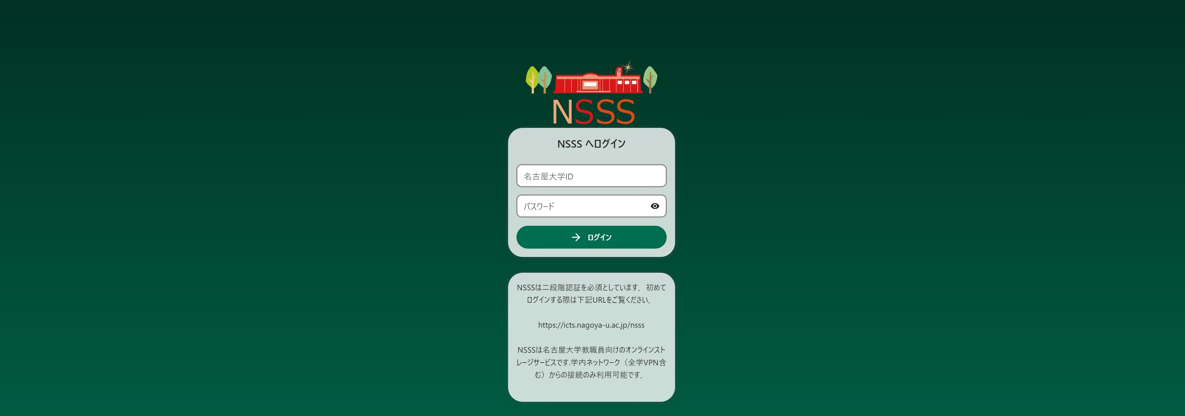 NSSS (Nagoya-univ Secure Storage Service) は,名古屋大学に所属する教職員の教育研究に関わるデータの保管・管理に関する利便性向上を目的としたサービスです. ここでは以下でNSSSを使う際の基本的な説明をしています。
