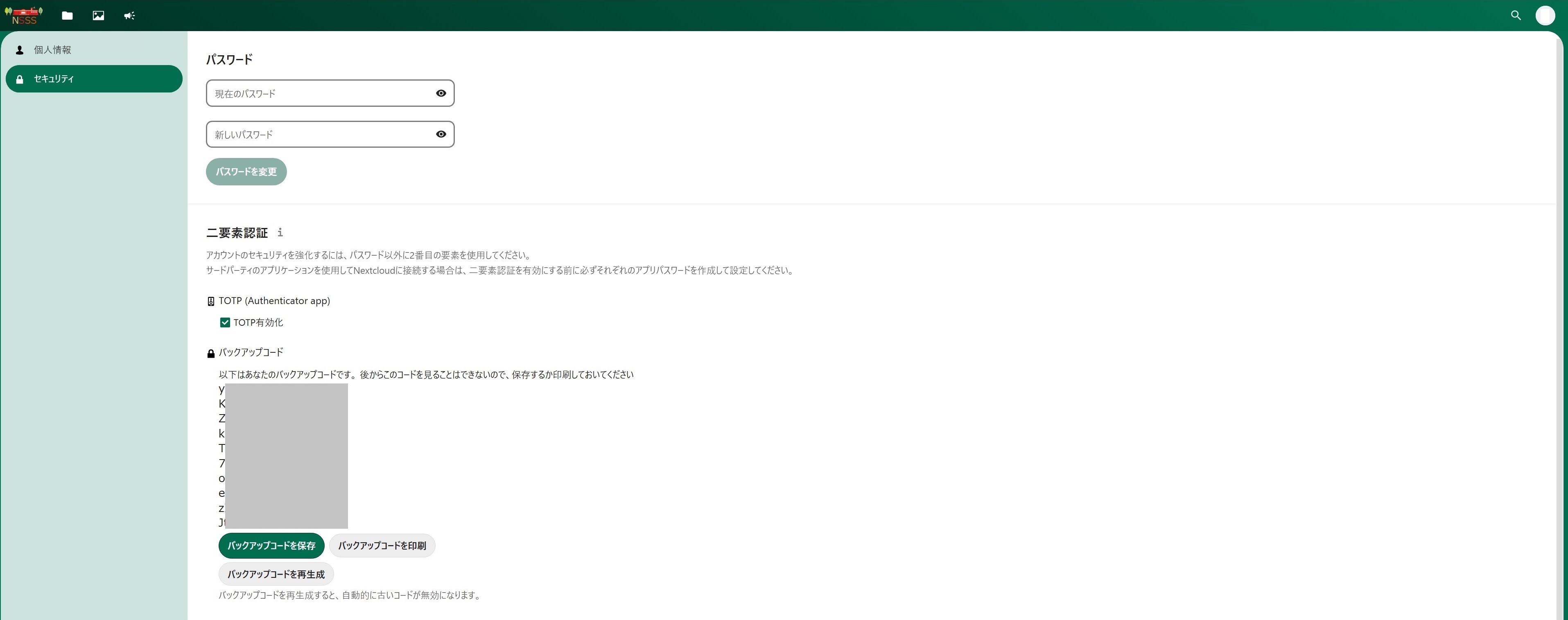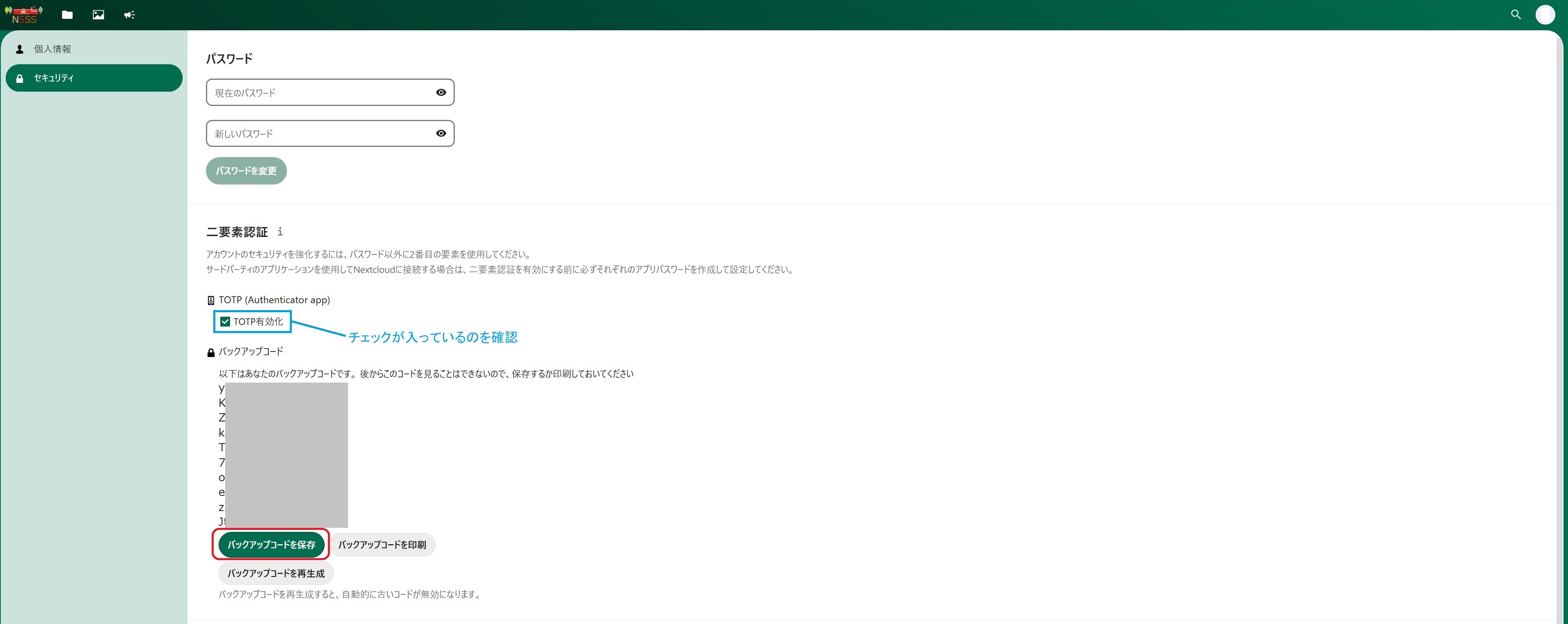 NSSSにログインします。画面右上のアイコン→設定→セキュリティの画面で「バックアップコードを生成」をクリックします。