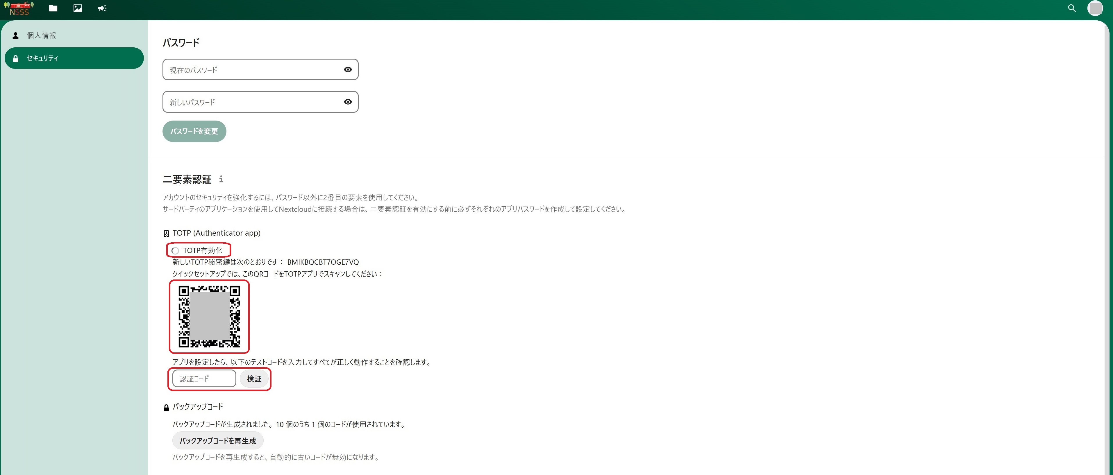 画面右上アイコン内の設定よりセキュリティ画面へ移動し、「TOTP有効化」をチェックすると、QRコードが表示されます。既に「TOTP有効化」の状態になっている場合は「TOTP有効化」のチェックを外して,もう一度有効化してください.