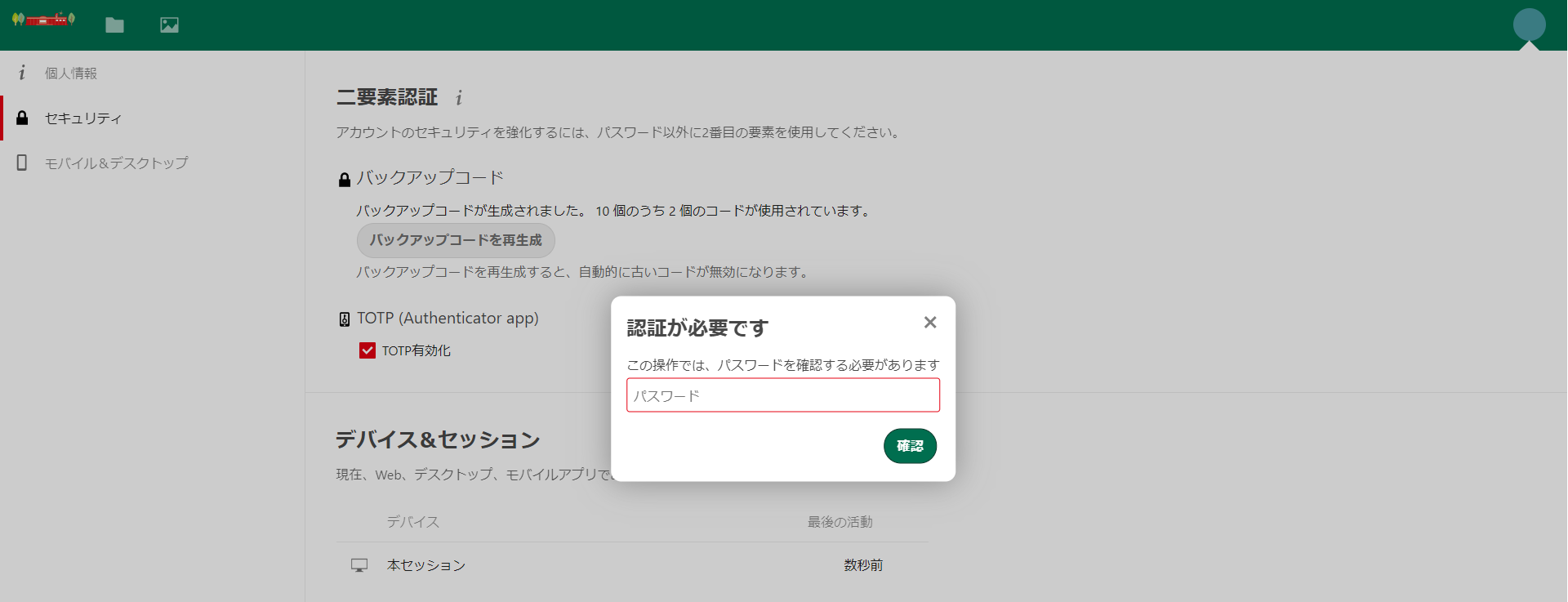 次回のログインでは、この新しく保存したバックコードが使用できます。