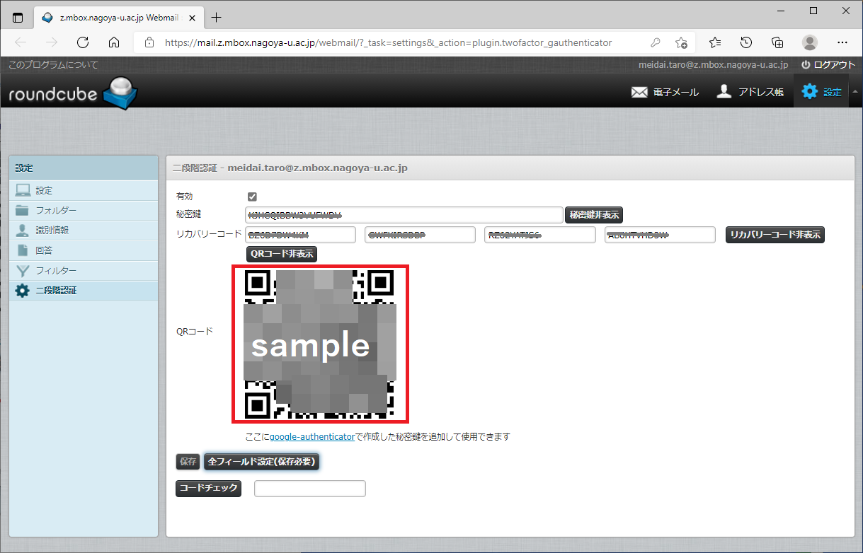 - 「RoundCube2FA mail.DOMAIN.nagoya-u.ac.jp(Roundcube:meidai.taro@DOMAIN.nagoya-u.ac.jp)」の名前で秘密鍵が登録されます。