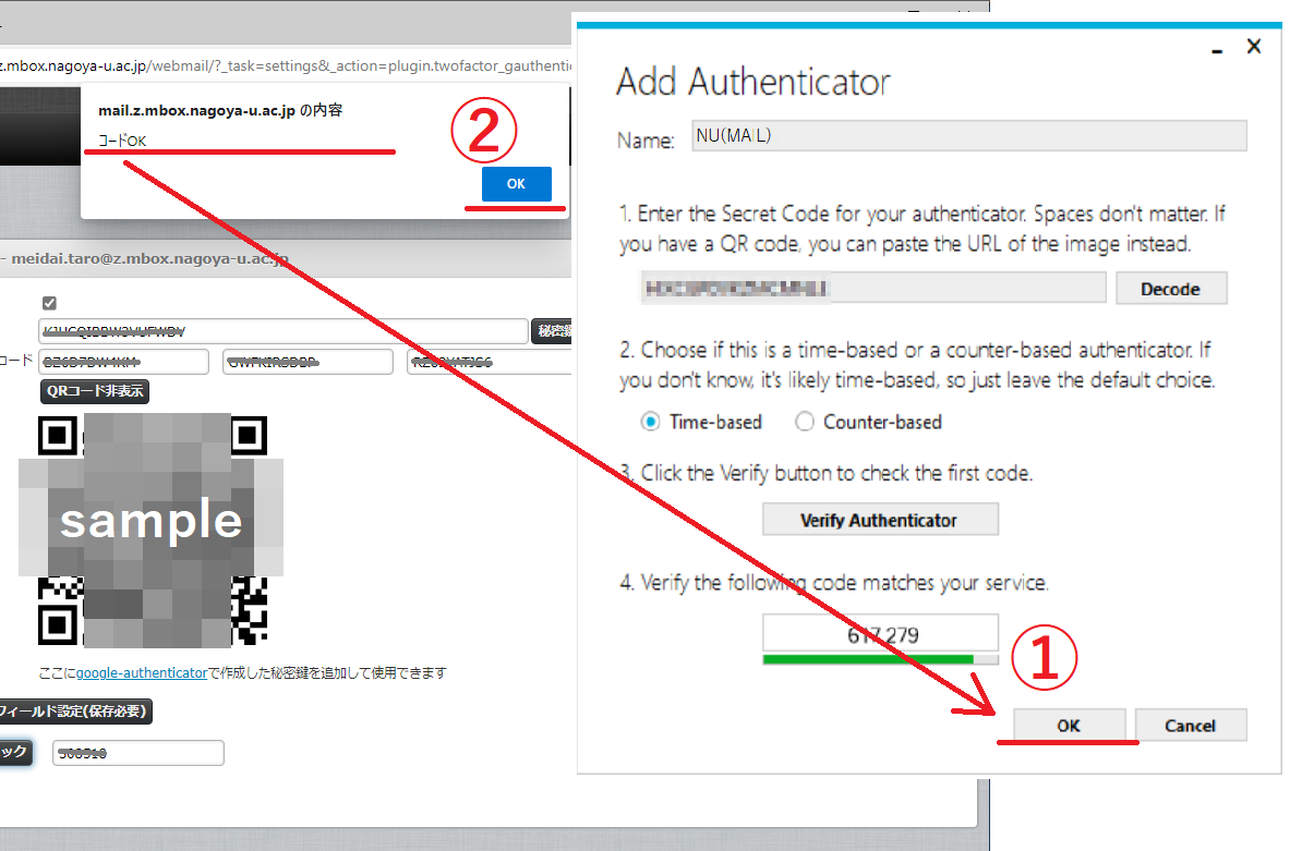 設定が正しければ、メールの画面上部に「コードOK」とポップアップが表示されます。ポップアップは②の「OK」ボタンを押すと閉じられます。